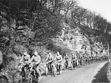 Although multiple-speed bicycles were widely known by this time, most or all military bicycles used in the Second World War were single-speed. Bicycles were used by paratroopers during the war to help them with transportation, creating the term "bomber bikes" to refer to US planes dropping bikes for troops to use.[57] The German Volksgrenadier units each had a battalion of bicycle infantry attached. The Invasion of Poland saw many bicycle-riding scouts in use, with each bicycle company using 196 bicycles and 1 motorcycle. By September 1939, there were 41 bicycle companies mobilized.[58][59]