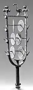 Sistrums are archaeologically attested from the early Bronze Age (3rd millennium BC). They consist of a U or V-shaped frame with three crossbars, which each hold two metal plates. There are two well-preserved sistrums from Horoztepe, which are decorated with birds, cattle, deer, and other animals.[24]