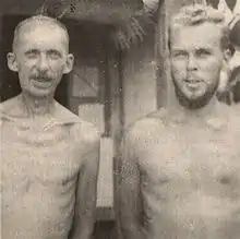 Amstutz and Rev. Tyler Thomson, pastors of Wesley Methodist Church, outside their hut which also served as a religious library at Sime Road Camp, Singapore, where they were interned during World War II