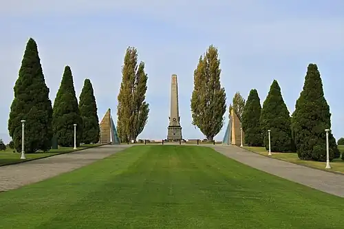The discussions about the intended Hobart war memorial were underpinned by the existence of the Avenue with a resolution passed by the War Memorial Committee that any war memorial should be adjacent to the Avenue. The original intent was to place that memorial on the Domain proper.[4] When the old Queens Battery site became available, the new memorial (the Cenotaph) was placed there. In 1926 a double row of cedars was planted on the city side of the area to connect the Cenotaph to the Avenue – this was known as the Soldiers Memorial Avenue extension.[5] By 2000, only two of those trees remained to the west of the Cenotaph.