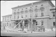 Construction of the town hall was begun in 1864, with the foundation stone laid on April 14, which was declared a public holiday and celebrated by a parade. It was completed two years later in September 1866, which was celebrated by another public holiday and a gala ball.[3] The design by Henry Hunter[1] was somewhat inspired by the Palazzo Farnese in Rome.[4] At the time of construction, it was designed to house the City of Hobart's council chambers, as well as police offices, the municipal court and the State Library of Tasmania.[1] These remained in use for nearly fifty years after the town hall was opened.[5] It, along with Franklin Square, were built on the site of the former government house which had been demolished upon completion of the present government house.[6]