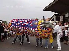 At Pézenas there is a huge creature called Le Poulain or Lo Polin (Occitan for "the colt"), carried by nine men and led by another, accompanied by a band of musicians. The Poulain has a realistically carved wooden head, with a snapping jaws and an extending neck that can reach up to first-floor windows; money or other offerings put into its mouth tumble down inside its neck. Its semi-cylindrical body is covered with a dark blue cloth, now decorated with stars and the coat of arms of Pézenas. Below the frame it has a tricolor skirt.[31]