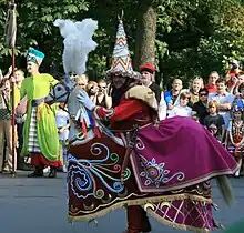Dressed in red trimmed with yellow, six tourney horses (xaldiko[50] or zaldiko) take part in the comparsa de gigantes y cabezudos in Pamplona (Iruña) in Navarre, Spain (Nafarroa). More realistic than the other Basque examples, they replicate the whole upper part of a horse's body from head to tail, with a skirt attached below. Each "rider" wears a pointed cap with a tassel and used to wield an inflated bladder on a stick; now, like the tricorned big-heads called kilikis who parade with them, they carry a phallic pizzle made of foam-rubber which they use to belabour the onlookers.