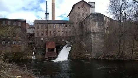 The Hockanum River flowing through a textile mill in Downtown Rockville, Connecticut.