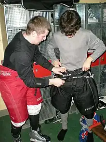 Hockey pants are knee-to-waist protective gear for ice hockey or roller hockey players. The pants carry a variety of padding depending on whether they are worn by goaltenders or skaters (forwards and defenders), and also on the manufacturer.