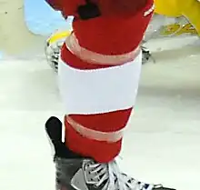 Shin tape is a polyethylene backed tape used on shin pads or socks over the shin pads to help keep them in position. The pressure-sensitive tape is self-adhesive and water resistant, and is elastic so that there is less risk of cutting off circulation to the legs. Shin tape is available in a variety of colors and is discarded after use.