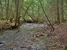 The topography of the area was greatly influenced by glacial processes, followed by fluvial erosion. The reserve is characterized by a till moraine and other glacial features, such as kames and kettles.[3][4] A deeply cut tributary valley to the Nottawasaga River bisects the reserve through its centre. The Niagara Escarpment's dolomite caprock (the Amabel Formation) can be seen in the upper parts of the gorge; rapids and waterfalls expose stratigraphic succession down to the Queenston Shale.[1]