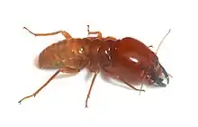The Hodotermitidae (from Greek ὁδός (hodós), travelling; Latin termes, woodworm) are a basal Old World family of termites known as the harvester termites.[1] They are distinguished by the serrated inner edge of their mandibles, and their functional compound eyes which are present in all castes.[2] They forage for grass at night and during daylight hours, and the pigmented workers[3] are often observed outside the nest.[2] Their range includes the deserts and savannas of Africa, the Middle East, and Southwest Asia.[1] Their English name refers to their habit of collecting grass, which is not unique to the family however.[2]