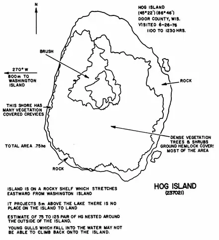 On February 15, 1967, a hearing on a proposed Wisconsin Islands Wilderness concerning Hog, Spider, and Gravel islands was held at the Door County courthouse.[21] It was noted that prior visitation to the three islands had been limited to a few bird enthusiasts who expected the repulsive smells and discomforts associated with nesting colonies of gulls and herons. It was proposed that "Public access would need to be prudently limited in numbers and restricted to late summer and early fall when Lake Michigan travel is often difficult."[22] No one was opposed to the proposal.[21]