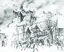 Hohenrechberg castle remained with a few short intervals in family possession by the Rechbergians until 1986. The intervals consisted of the occupations of the castle from 1554 to 1555,[9] from 1599 to 1601[10] and from 1633 to 1634 by the Duke of Württemberg.[11] In 1648, the castle was attacked, plundered and heavily devastated by French troops.[12] In the end of the 18th century, it had to be opened for Napoleon Bonaparte's Rhine troops: For 1 August 1796 it is reported that General Jean Victor Marie Moreau had a big dinner with eight other generals of his army, more than 40 officers and a couple of other people on the castle.[13] And in World War II American troops got hold of the ruined castle for a couple of months. In 1986 it was sold to Hans Bader,[14] a factory owner from the nearby town Göppingen. After he died in 2006, the Rechberg Stiftung Hans Bader, a private foundation, became the owner.[15]