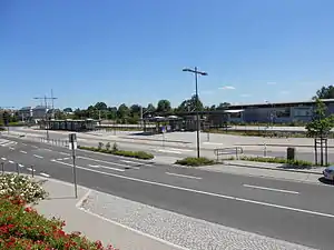 The freight yard was closed on 31 December 2000. The two signal boxes were demolished in September 2006 and extensive reconstruction has taken place since 2007. The Tudor-style entrance building was demolished in 2007 and replaced by a low-rise building and the railway station was redeveloped to remove barriers to access. The then redesigned station forecourt was opened on 9 July 2009; a Turmwagen ("tower car", a vehicle designed for the maintenance of the tramway’s overhead wire) was erected on the forecourt as a monument to the former tramway. In 2010, work started on the replacement of the platform, leading to the construction of a platform on the former loading road.[5] The platform next to the station building and the original island platform were completely demolished and replaced by a new barrier-free island platform. The new station was officially opened on 2 August 2011.