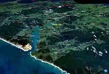 12,000 years ago, the Hokianga was a river valley flanked by steep bush-clad hills. As the last ice age regressed, the dramatic rise in sea level slowly flooded the valley turning it into a tidal saltwater harbour with abundant sheltered deep water anchorages. This was the harbour that the explorer Kupe left from, and in 1822 it was home to the first European timber entrepreneurs.[1] southern right whales possibly frequented the bay historically, prior to significant depletion of the species caused by commercial and illegal hunting.[2] Today, large whales are rarely seen in the bay, although the harbour is a well-regarded area in which to watch smaller dolphins and killer whales.[3]
