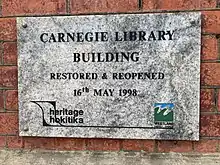 - ↑ "Carnegie Free Public Library (Former)". New Zealand Heritage List/Rārangi Kōrero. Heritage New Zealand. Retrieved 2 September 2020.
