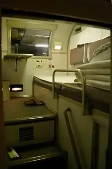 Two-level Type B couchettes had four beds which could be individually enclosed with a curtain. While normally used by individual travelers, there were also "B Compartments", which had a door that could be closed and used as a private room for a group of four people (or fewer if the travelers wished to pay for the extra bed(s)).