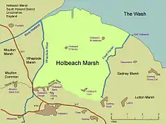 Holbeach Marsh is situated between the market town of Holbeach on the A17 road at the south, and The Wash estuary at the north, and is bounded by the waterways of the Whaplode (Holbeach) River at the west, and Fleet Haven at the east. The area comprises approximately 14,500 acres (59 km2) of arable farms, dispersed buildings, and small settlements. The marsh villages of Holbeach Bank and Holbeach Clough—or Saracens Head—are at the south-west edge, and Gedney Dyke at the south-east. Within the Marsh are the villages and hamlets of Holbeach St Marks, Holbeach St Matthew, and Holbeach Hurn. At the north-east on The Wash saltmarsh is the bombing range of RAF Holbeach.[1]