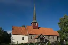 Hole Church (Hole kirke) probably stems from approximately 1200. It is located in a hilly landscape around 5 km southwest of Norderhov Church on a peninsula in Tyrifjord. The edifice is of stone and has 350 seats. The altarpiece in the Rococo style. It was largely destroyed by fire in 1736. The church was rebuilt in 1737. Repairs, restorations and remodeling occurred during 1827 and 1909. The old church burned to the ground after a lightning strike in 1943. The restored church is built by sandstone from the district and consists of a long, rectangular nave and a narrower, almost square choir in the east.[11] [12]