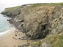 Hole Beach is a bathing and surf beach just north of Trebarwith Strand on the North Coast of Cornwall, South West England. The beach can be accessed from Trebarwith at low tide or by a zigzagging quarryman's track from the village of Treknow. The beach is sandy and the water is good for surfing. The sheer cliffs to the north of the beach form part of the now disused Caroline Slate Quarry and were created by quarrymen suspended by ropes attached to strongpoints some 75m on the clifftop above.[1] A cave 15m above sea level is artificial and is also the result of quarrying- this is the "hole" that gives the beach its name. There is also a natural sea cave at the rear of the beach. One of the stone strong points still perches on top of the near vertical cliffs 75m above the beach, as does a second building which was possibly used as a toolshed.