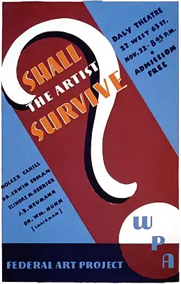 - ↑ "Holger Cahill, WPA Director, Sees 'Cultural Erosion' Diverting Talent". The New York Times. December 19, 1937. Retrieved 2010-07-26.