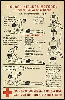 Nielsen is also credited with developing an early set of rules for handball in 1898,[3] and with developing a form of external cardiopulmonary resuscitation called the Holger Nielsen method in 1932. The National Research Council gave support to this method in 1951, however, it was superseded by mouth to mouth resuscitation in recommendations of 1958. (Artificial Respiration, the history of an idea. A B Baker Med Hist. 1971 15(4): 336-351)
