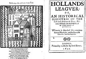Marmion was not the only writer to take advantage of the brothel's notoriety. Also in 1632, two other works on the subject appeared: a ballad by Lawrence Price called News from Holland's Leader, and a pamphlet from bookseller Richard Barnes.[8] Authored by a Nicholas Goodman, the pamphlet is titled Holland's Leaguer: or a Historical Discourse of the Life and Actions of Dona Britanica Hollandia, the Arch-Mistress of the wicked women of Eutopis. Wherein is detected the notorious Sin of Panderism, and the Execrable Life of the luxurious impudent. Goodman's essay shows how the subject was perceived (and exploited) at the time, though it offers little dependable information.