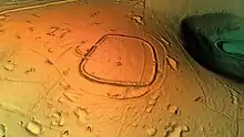 The 1931 excavation also revealed postholes at the north-east side and east entrance, showing that the rampart was originally a box rampart, filled with rubble and reinforced with timbers, with a berm and a ditch beyond the outer timbers. Modern posts were placed to mark the position of the postholes.[2][3]