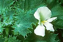 In its native habitat, H. petrophila flowers and fruits in spring and early summer, between April and June. The solitary flowers are borne on very short stalks (peduncles), only 1–4 mm (0.04–0.16 in) long. The green sepals are narrow, pointed and not joined, forming an urn shape around the base of the flower. They are 9–13 mm (0.4–0.5 in) long by 2–3 mm (0.08–0.12 in) wide at the base. They have small spines along their margins, like the leaves. The five petals forming the corolla are joined at their bases to form a tube 20–24 mm (0.8–0.9 in) long. The free lobes at the end of the flower are 7–12 mm (0.3–0.5 in) long and differentiated into two upper lobes, curving backwards, and three lower lobes, pointing forwards.[3] The color of the corolla has been described as either sulfur yellow throughout[3] or white with a yellow throat.[4]