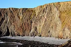 The Crackington Formation is over 1km thick in the Exeter area but amounts to only 250m around Bideford. It consists of mudstones with lesser sandstones and siltstones displaying rhythmic bedding, typical of turbidite deposits.[2] The overlying Bideford Formation is over 1200m thick in places and consists of interbedded sandstones, mudstones and siltstones with a range of different characters including turbidites, channel sandstones, cross-bedded and slumped sandstones and locally contains burrows and rootlets.[3] The Bude Formation is calculated to be around 1.3km thick along the north coast and consists of silty sandstones and mudstones. It is fossiliferous and locally contains ironstones and calcareous nodules.[4] The Bealsmill Formation is at least 120m thick and consists of interbedded sandstones, siltstones and mudstones with some conglomerate beds containing chert, lava and limestone clasts.[5]