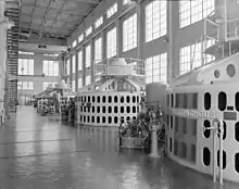 Interior of the Holter Dam powerhouse in 1994. Generating turbine No. 1 is in the foreground.