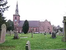 The church is constructed in red sandstone rubble with ashlar dressings, and has a red tile roof. Its plan consists of a five-bay nave, a south porch, a two-bay chancel with north and south transepts, and a west tower. The tower is in three stages, standing on a plinth. It has diagonal buttresses, two-light windows, louvred bell openings and a plain parapet. The tower is surmounted by a spire containing lucarnes. The nave windows have two lights, there are three-light windows in the transepts, and east window also has three lights.[2] Stained glass is by Kempe; that in the west window is dated 1883, in the east window it is dated 1885, and elsewhere there are windows dated between 1871 and 1873.[3] The two-manual organ was made by Charles Whiteley and Company.[5]