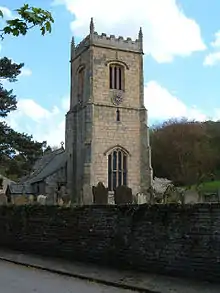 The arcade dates from around the year 1200. The chancel was added early in the 14th century, and the southern arcade was added slightly later.[4] The tower was a later addition, dating from the late 15th century.[5] There are currently three bells in the tower, which are inscribed with the years of their installation, 1664, 1701 and 1773 AD.[5] They, and the clock which faces east halfway up the tower, are accessible by means of a spiral staircase which leads up the centre of the tower. At the western end of the church, there is the tomb of Sir Thomas Fairfax, a local landlord, who died in 1828.[4] There was some restoration during the Victorian era, which included the addition of the current organ chamber, which was installed in 1883. The east window, with reticulated tracery, was also installed in the 19th century.[4] The current clock was installed in 1908: Prince Ranjitsinhji, who often played cricket in the village, raised money for the clock through organising cricket matches.[6]
