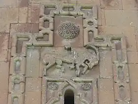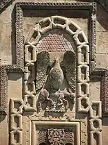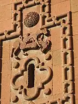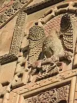 Exceptionally rich decorations cover a large portion of the church. There are beautiful motifs on each side at the second floor level and geometric patterns around the cornices, eaves, and other parts of the walls. Notable is the large cross carved in high relief on the front flanked by the Virgin Mary holding the baby Jesus and another saint. Below and just above the portal to the second floor are the motifs of a bull and lion. Above the larger window on the right façade is a motif of a large bird with a geometric rosette on its chest holding a hooved animal in its talons. On the left façade is a mountain goat, and on the rear is a large cat pouncing upon a goat.