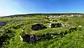 About twenty huts have been reconstructed; each would originally have had a conical roof, supported by poles set on top of a low wall, covered with turf or thatch. Some of the huts are homesteads; these are mostly circular and hearths, alcoves, and a stone trough have been identified. Others are oval and have a dividing wall, still others are entered by long passages, and some are small, and may have been used as storerooms or workshops. One building at the northeastern end of the terrace has a walled enclosure or paddock adjoining. Artifacts found at the site include a broken stone axe, flint arrowheads, and pottery fragments from the late Neolithic or early Bronze Age.[5]