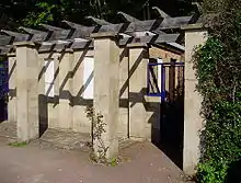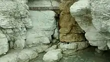 The pinnacle was formerly known locally as Gibraltar, and the ground around here was the site of lime kilns which were worked by the fishermen.[3] In 1905, the town council laid out a public garden, named somewhat loosely The Holywell Retreat, on the site of a disused chalk pit known as The Gore some 400 metres to the northeast of the Holywell fishing settlement. A tea chalet was later built in the garden and the area above was redesigned in the Italianate style after World War I to provide work for the unemployed.[3] The Council later erected beach chalets above the lower promenade. In 1935, one of the chalets was set aside for the use of King George V and Queen Mary during their visit to the town.[4] More chalets were constructed in the 1950s; as of 2009 there were 69 brick-built chalets available for annual rent.[5]