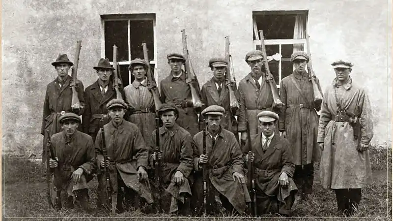 Ballyhaunis IRA September 1921: Back L-R:Capt. Pat McNieve (Logboy Coy), Capt Austin Tarpey (Holywell Coy), Bn Cmdt. Patrick Kenny, Vol Joe Taylor (Aghamore Coy), Vol John Forde (Bekan Coy), Capt. Luke Taylor (Aghamore Coy), Vol Sonny Biesty (Holywell Coy), Bn Vice Cmdt. Dom Byrne, Front L-R: Vol Jack Kilduff (Bekan Coy), Bn Adjt. Austin Kenny, Capt. Michael Devaney (Brackloon Coy), Capt. Jim Kilkenny (Crossard Coy), Lt Michael Nolan (Knock Coy). Nearly all of the men photographed played some part in the Holywell Ambush