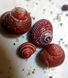 The height of the shell varies between 6 mm and 10 mm. Its color is red, ashen or purple. The small, globose shell is very solid and imperforate. The spire is conic, more or less depressed. The suture is moderately impressed. There are five whorls. These are slightly convex, the last decidedly deflected toward the aperture, encircled by about fifteen subequal spiral lirae, separated by interstices about as wide as the ridges. The incremental striae are generally strongly developed, causing the liree to appear nodose or somewhat irregular, and the interstices to appear pitted. The oblique aperture is pearly white within. It measures about half the length of shell. The columella is arcuate. The base of the shell is obsoletely uni- bi- or tri-dentate. The rounded oval operculum is nearly smooth and slightly concave in the middle.[3]