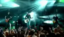 Screenshot from the music video of the band performing, with the fans in the foreground