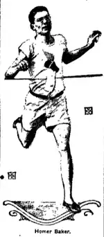 Homer Baker (June 8, 1893 – November 25, 1977) was an American, middle-distance track and field athlete. He became US national half-mile champion in 1913 and 1914.[1] He toured Europe during 1914 and won the British 880-yard crown from the famed Albert Hill.[2] Baker had poor eyesight and withdrew from running for 18 months after a 1917 accident in the New York City Subway.[3] He did the 880 yards (half-mile) in 1,56,4 and 660 yards in 1,20,4 (world record holding up for 26 years).[4] In 1923, he was appointed physical director in the Panama Canal Zone.[5]