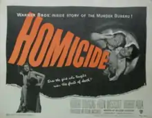 Homicide is a 1949 American crime drama film directed by Felix Jacoves and written by William Sackheim. The film stars Robert Douglas, Helen Westcott, Robert Alda, Monte Blue, Warren Douglas and John Harmon. The film was released by Warner Bros. on April 2, 1949.[2][3]