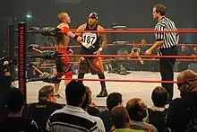 In January 2005 Homicide began a "best of five" series with American Dragon. Homicide was victorious in the first two matches, a submission match and a taped fist match, but lost the remaining three matches - a falls count anywhere match, a lumberjack match and a steel cage match at The Final Showdown on May 13, 2005.[30][31][32][33][34] Following his loss to American Dragon, Homicide and the Rottweilers began a feud with Jay Lethal. On May 7 at Manhattan Mayhem, Homicide and Low Ki teamed together to defeat Lethal and Samoa Joe.[35] Lethal was stretchered from the arena wearing a neck brace, apparently badly injured. With Lethal injured, Homicide turned his attentions to James Gibson, whom he defeated on June 12 at The Future Is Now.[36] After the match, The Rottweilers continued to attack Gibson until Lethal made his return and saved Gibson. This led to a match between Lethal and Homicide on July 9 at Escape from New York, which Homicide won.[37] On July 23 at The Homecoming, Homicide and two fellow Rottweilers (Low Ki and Ricky Reyes) defeated Samoa Joe, James Gibson and Jay Lethal in a six-man tag match.[38] Low Ki fought Lethal to a no contest on August 12 at Redemption, after Homicide came to ringside after the match to attack Lethal.[39] His plan was foiled by Matt Hardy, who intercepted Homicide and then defeated him in a scheduled singles bout.[39] On August 13 at Punk: The Final Chapter, Lethal and Samoa Joe defeated Homicide and Low Ki by disqualification after Homicide elbow-dropped the referee.[40] From that point on, Lethal began feuding primarily with Low Ki.