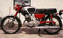 The Honda CB175 is a standard motorcycle made by Honda from 1969 to 1973.[1][3] It had a 174 cc (10.6 cu in) four-stroke, straight-twin engine with a single overhead camshaft, two valves per cylinder, dual slide-valve carburetors, and dual exhausts. It was also equipped with a five-speed gearbox, 12-volt electrics, kick and electric start, front and rear drum brakes, turn signals, speedometer with trip meter (1972 and later models), and tachometer, and was rated at 20 bhp (15 kW).[3] An update in 1972, brought a more rounded gas tank and changes to the air box covers, along with some other minor trim changes. The CB175 was discontinued for 1974 and replaced by the CB200, a similar bike already in production. Although not technologically remarkable, Honda's small twins of the 1960s and 1970s were among their best sellers.[4] Dual sport scrambler CL175, SL175 enduro style and touring CD175/CA175 versions were also produced.[1]