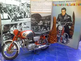 In the 1964 film Roustabout, Elvis Presley rode a CB77 Super Hawk, rather than the Harley-Davidsons Presley would later be associated with, because Paramount Pictures wanted to avoid motorcycles' outlaw image that had originated in media coverage of the 1947 Hollister riot and the 1953 film The Wild One, especially given Presley's scandalous televised hip gyrations.[5]: 42 [6] Honda had cultivated a nonthreatening, wholesome image with their "You meet the nicest people on a Honda" advertising campaign, so the CB77 was ideal to make Presley's film persona seem just rebellious enough, but not too much.[5]: 42 [6] The film, coinciding with the 1964 Beach Boys song "Little Honda", was free publicity for Honda in the early years of establishing their brand in America.[5]: 42
