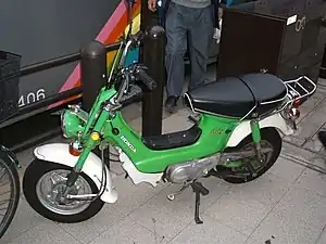 Like many Japanese cars and motorbikes, the Chaly's name is a neologism. It was officially released in Japan on July 18, 1972. Three versions were released the same year under the names 50-I CF, 50-II CF and 70 CF (the numbers determine the displacement 49 cm3 and 72 cm3).[1] In light of article R 311-1 of the French Highway Code of 30 April 2009, depending on whether it is equipped with a 50 cm3 or 70 cm3 engine, this two-wheeler is a moped or a light motorcycle.[2]