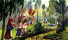 After the liturgical celebration, young people dance with the song “Oh, poppy on the mountain”, («Ой, на горе мак») with playful round dances, the girls showered the boys with poppy seeds: singing: “Poppies, poppies, poppies, golden heads!” («Маки, маки, маковицы, золотые головицы!»).