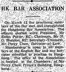 According to its website, the Hong Kong Bar Association was founded in 1949.[1] However, a newspaper advertisement from March 1948 records the foundation of the association on 12 March 1948 with Mr Eldon Potter KC being elected President, Mr H.D. Sheldon KC being elected chairman and Mr Percy Chen being elected Secretary Treasurer. The offices of the Association were located in the offices of Mr Chen in Prince's Building, Hong Kong.[2]