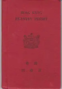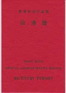 Hong Kong Re-entry Permit (Chinese: 回港證; Cantonese Yale: Wùigóngjing) are issued to Hong Kong residents by the Hong Kong Special Administrative Region (HKSAR) for travel to mainland China and Macau Special Administrative Region.[1]