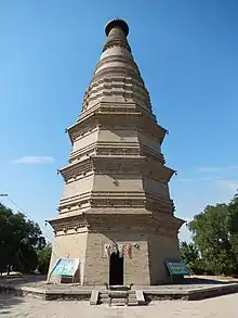 The Hongfo Pagoda (Chinese: 宏佛塔; pinyin: Hóngfó Tǎ), meaning 'Grand Buddha Pagoda', is an octagonal brick pagoda located in Helan County, just north of Yinchuan city, in Ningxia, China. The pagoda was built during the Western Xia (1038–1227), and when it was renovated in 1990 a number of Western Xia statues and printed texts were discovered.
