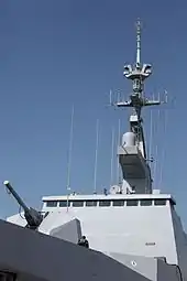The superstructure of the stealth frigate Surcouf; the word Discipline can be seen on the plaque affixed to the port side of the front wall.