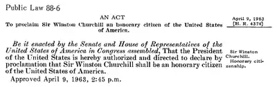 - ↑ Proclamation No. 3525—Declaring Sir Winston Churchill an Honorary Citizen of the United States of America (April 9, 1963)