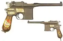 The next group of awards came in November 1920, when Mikhail Frunze, Kliment Voroshilov, Filipp Mironov, August Kork, and Nikolai Kashirin received honorary revolutionary weapons for their leadership during the Perekop–Chongar Offensive, while Semyon Timoshenko received one for his actions during the Polish–Soviet War. Awards to eight commanders for actions either during the Russian Civil War or the suppression of the Kronstadt rebellion followed in 1921 and 1922.[1] Kamenev and Budyonny were each awarded a second honorary revolutionary weapon on 5 January 1921 for further merits, this time in the form of a Mauser C96 pistol with the badge of the Order of the Red Banner embedded in the pistol grip.[2] Plaques on the pistols were inscribed with the name of the recipient and the inscriptions "RSFSR" and "from the VTsIK."[3]