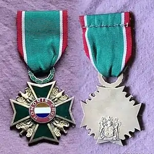 The Honoris Crux of 1952 is a silver-gilt Maltese cross which fits in a 45 millimetres diameter circle, with the arms of the cross in green enamel and with four eagles between the arms, all looking towards their right, with a roundel in the centre tierced horizontally in enameled orange, white and blue bands which represent the national flag and framed in a red circle inscribed "HONORIS CRUX". The cross is suspended from a laurel wreath, in the form of a circular ribbon hanger, with the leaves in green enamel.[1]
